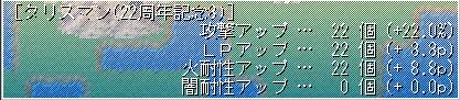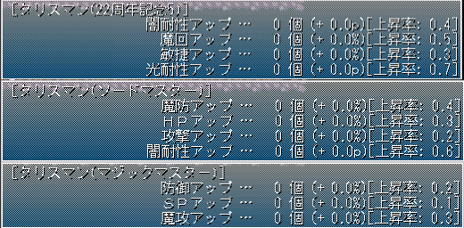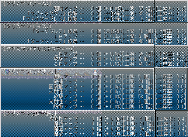 最終的につけたのは上画像の記念タリ。育てれば闇耐性も15くらい上がったかと思いますが、転生テトラループを繰り返すと劣化してしまいますし、入れませんでした。というかエレが無い。LPの小数点以下は四捨五入されると勘違いしており、ライフジュエルを無駄に2個入れてます。